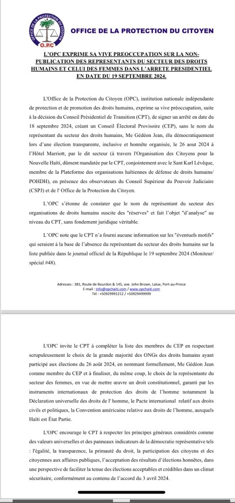 Le Protecteur du citoyen dans une communiqué de presse publié ce dimanche 22 septembre 2024 a manifesté leur préoccupation suite à la décision récente du Comité de CPT de publier un arrêté présidentiel pour la nomination des membres du Conseil Électoral Provisoire (CEP) sans inclure le nom de Monsieur Gédéon Jean. Ce dernier a été élu démocratiquement par le secteur des Droits Humains lors d’un scrutin transparent.